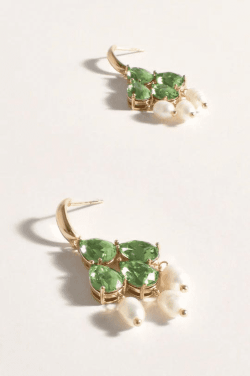 Crafted from Glass Jewel, Pearls, and Plated Metal.