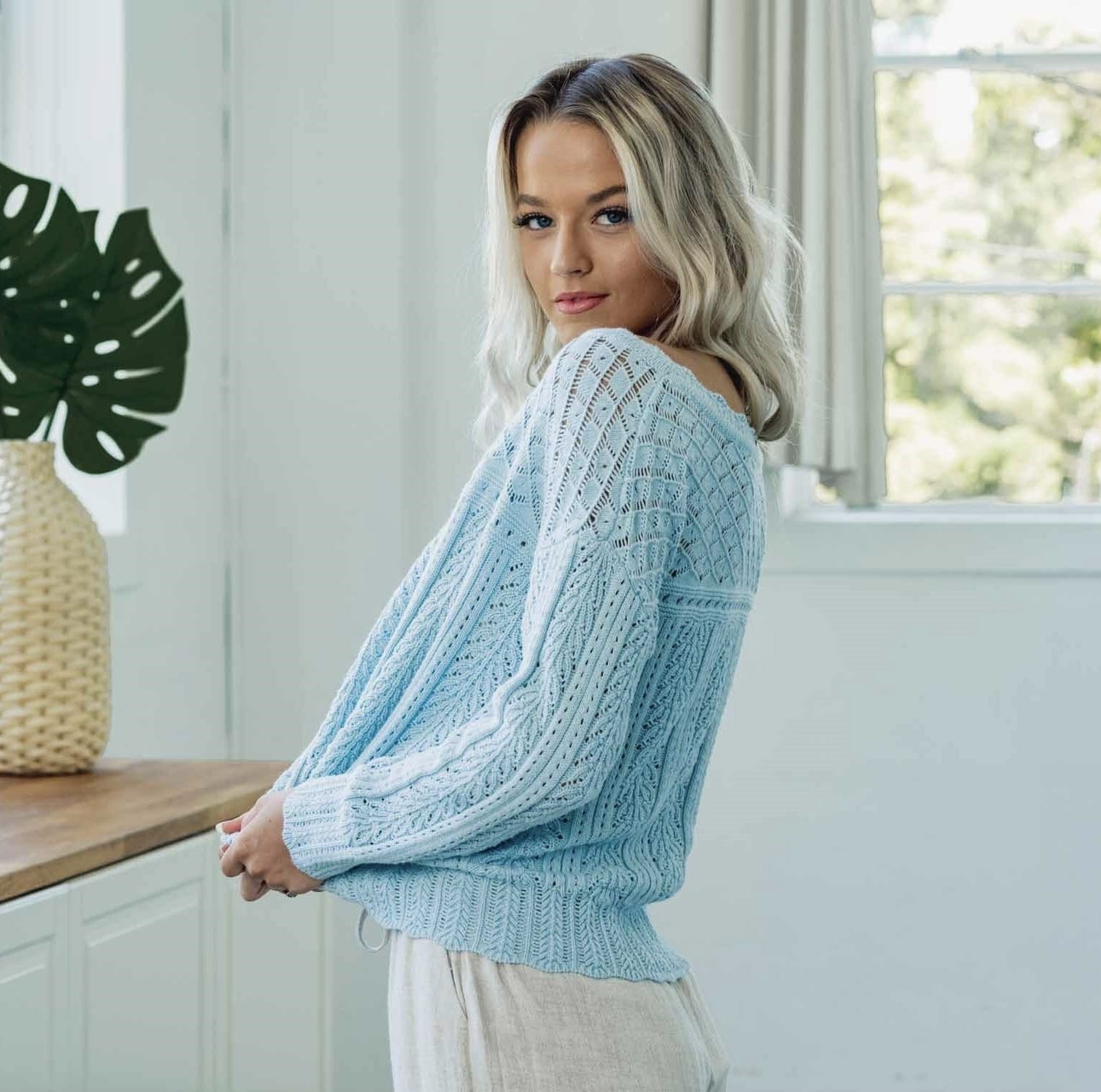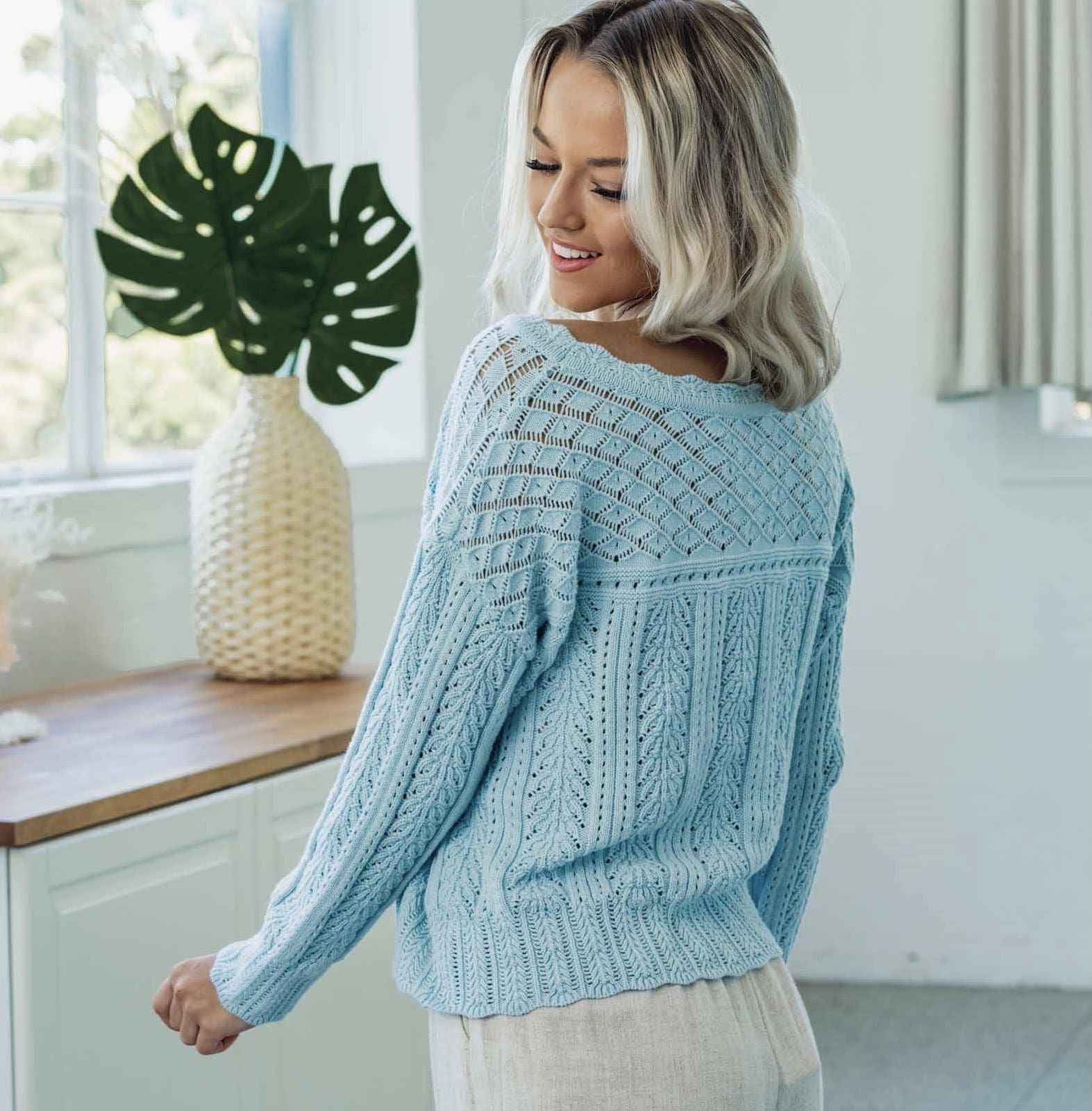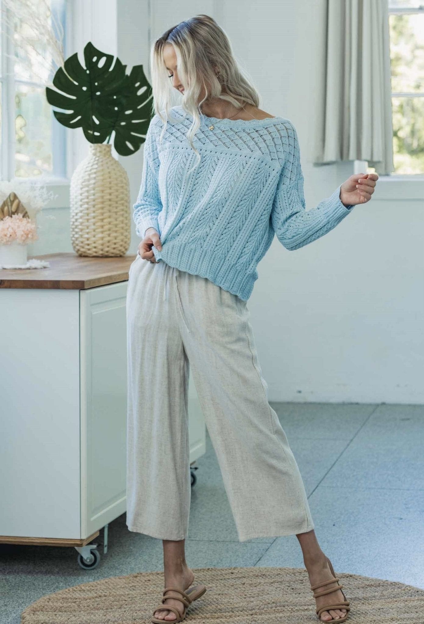 Add a dose of colour to your knitwear this season with our Amelia Knit. This sweater Features Cable lace print detail in a pastel baby blue colour that stand out from the rest.  Compliment the cropped hemline with your high rise pant or skirt.