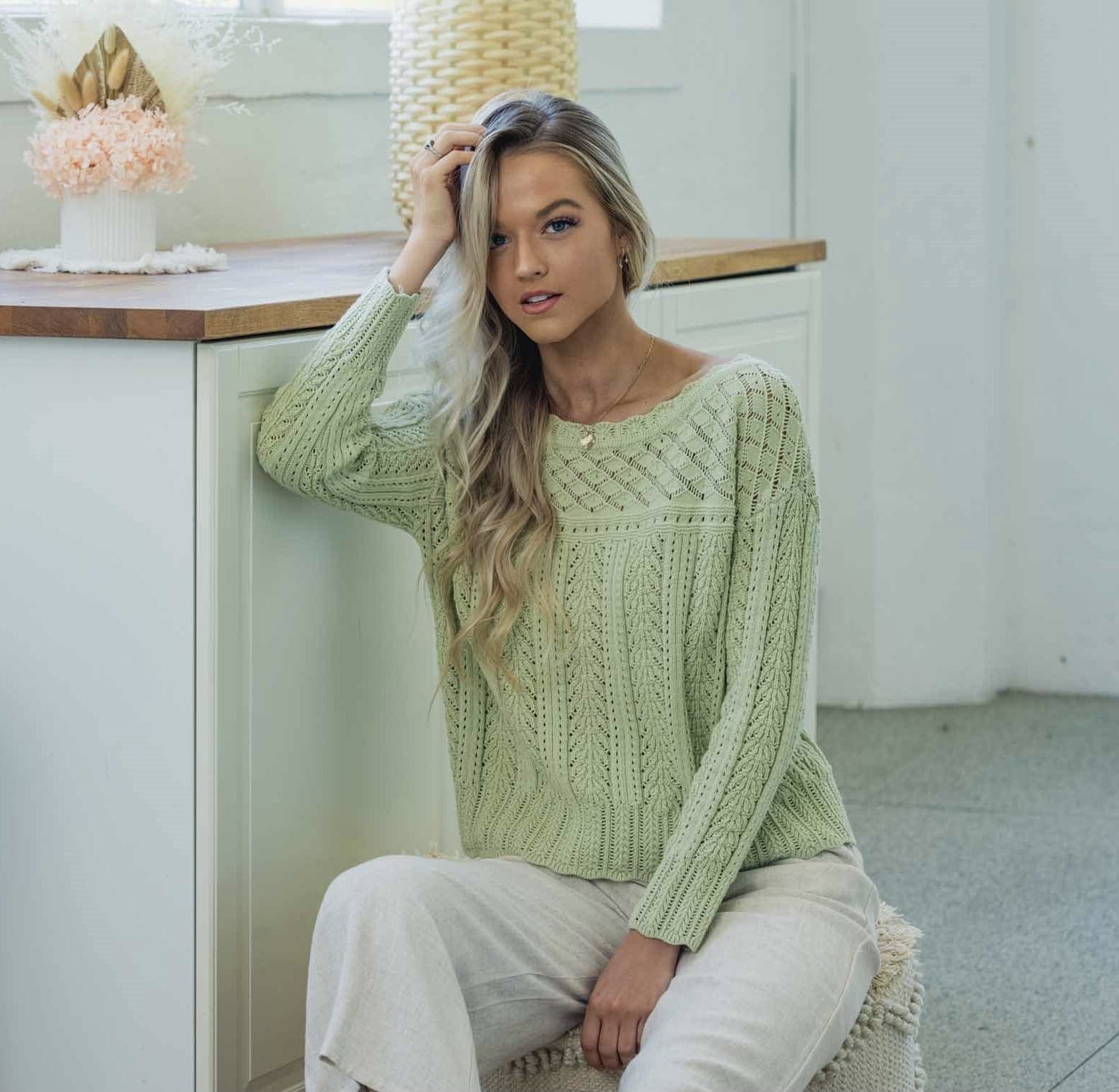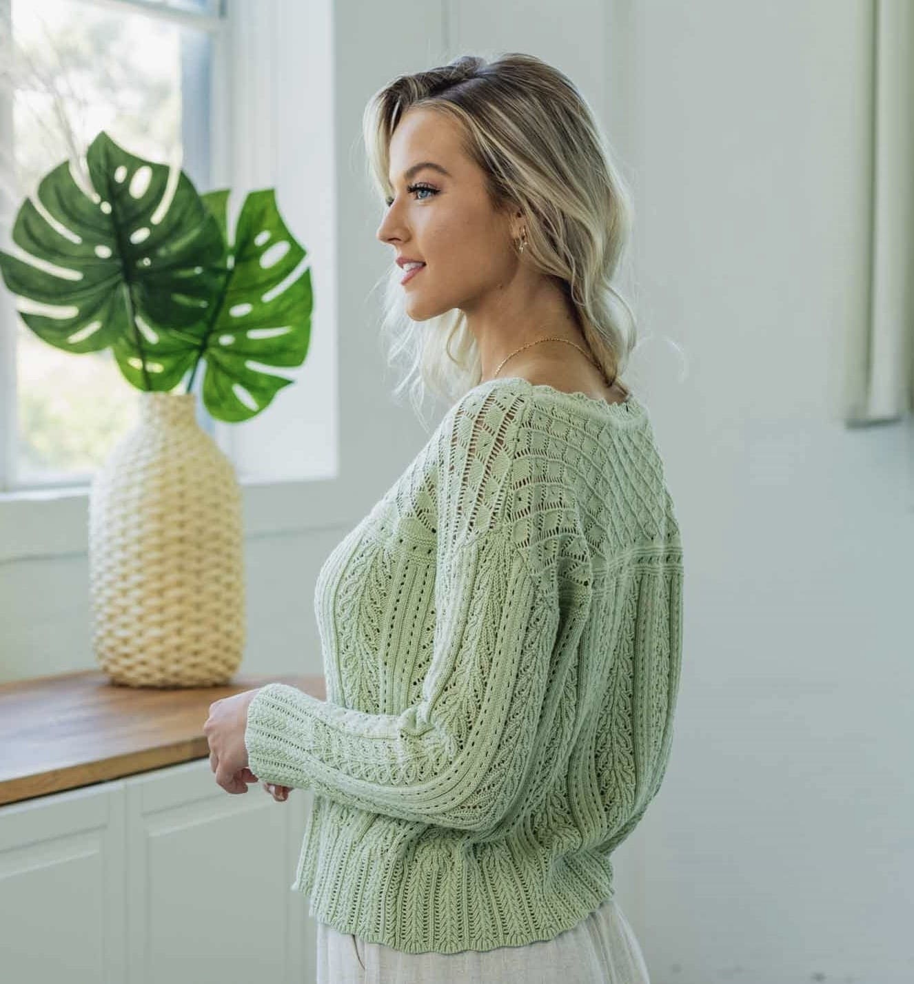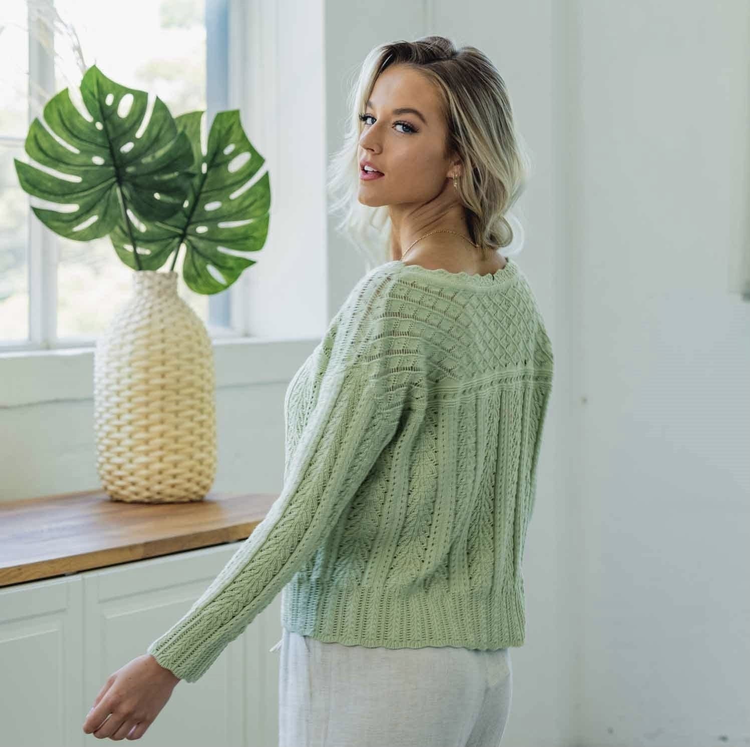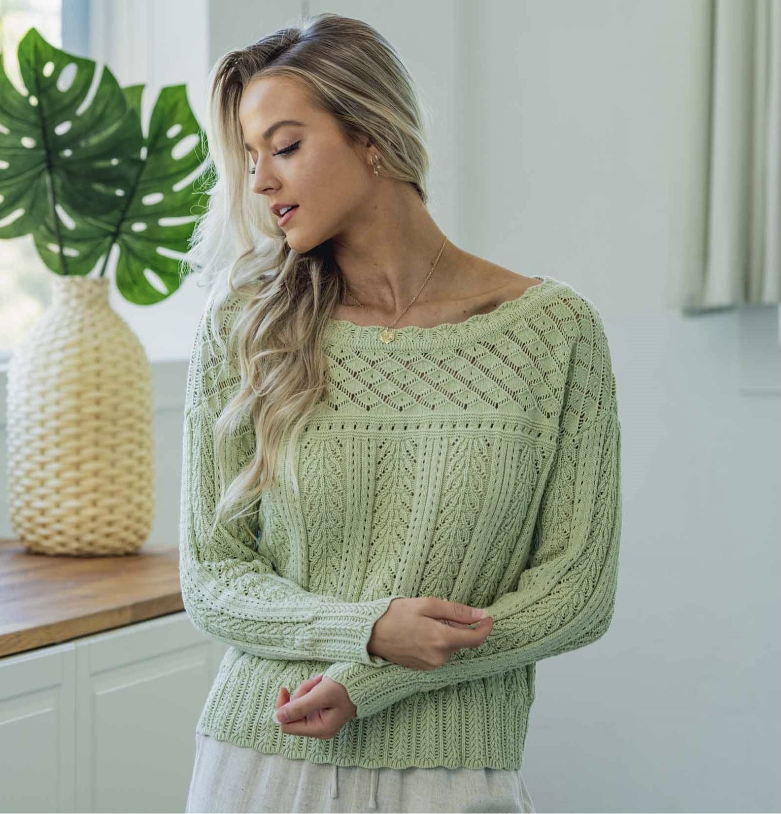 Add a dose of colour to your knitwear this season with our Amelia Knit. This sweater Features Cable lace print detail in a pastel green colour that stand out from the rest.  Compliment the cropped hemline with your high rise pant or skirt.