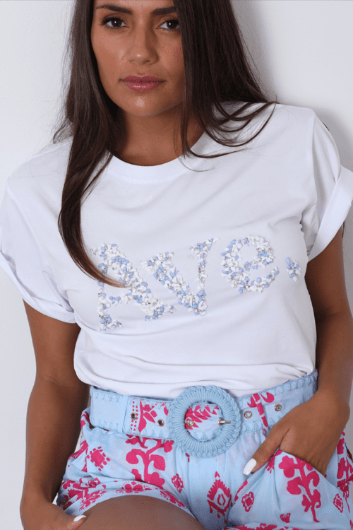 Our stunning new stunning blue rock encrusted tee will sure make a statement