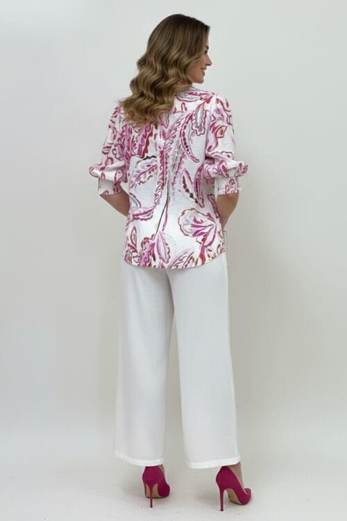 Radiate effortless feminine energy in the Avella Blouse. With its striking pink paisley print and elegant puff sleeves, this top is a must-have for summer garden parties or elevated brunch dates. Pair it with sleek white trousers for a polished look or your favorite denim for a chic weekend ensemble.