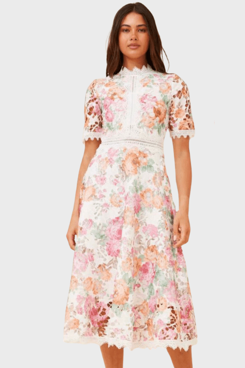 Nothing says elegance like a floral lace dress! This gorgeous dress features elegance and sophistication – with a gorgeous lace finish and stunning pastel flowers!