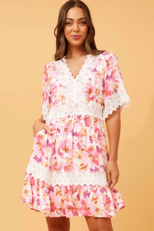 Bloom wherever you go in our Bouquet Lace Dress! 🌸💕 Embrace the charm of delicate flowers and elegant white lace in this short pink beauty. Perfect for those special moments when you want to feel as beautiful as a garden in full bloom