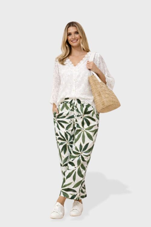Style with the Leonie Pants – Green Leaf for a fresh, coordinated set, or pair with denim and sandals for an easy everyday look. Add gold jewellery and a woven bag for soft coastal styling.
