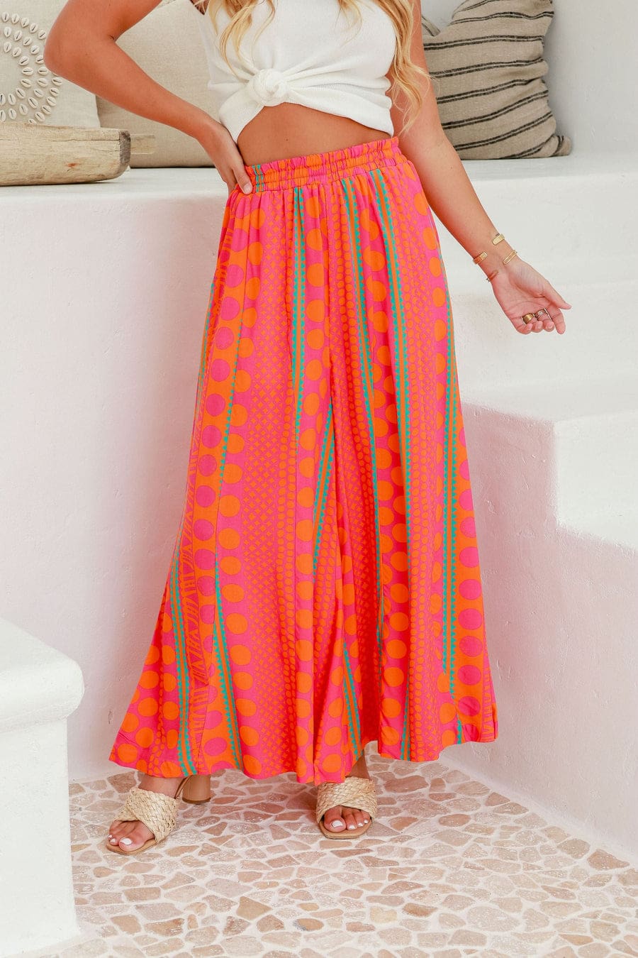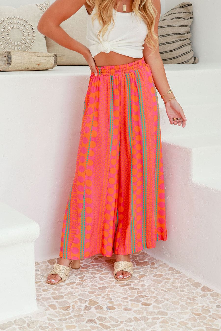 Infuse your wardrobe with Mediterranean charm in the Capri Sunset Pants. These flowing wide-leg pants feature a vibrant coral and pink pattern reminiscent of golden hour on the Amalfi coast. Lightweight and effortless – perfect for balmy evenings and sun-soaked adventures.