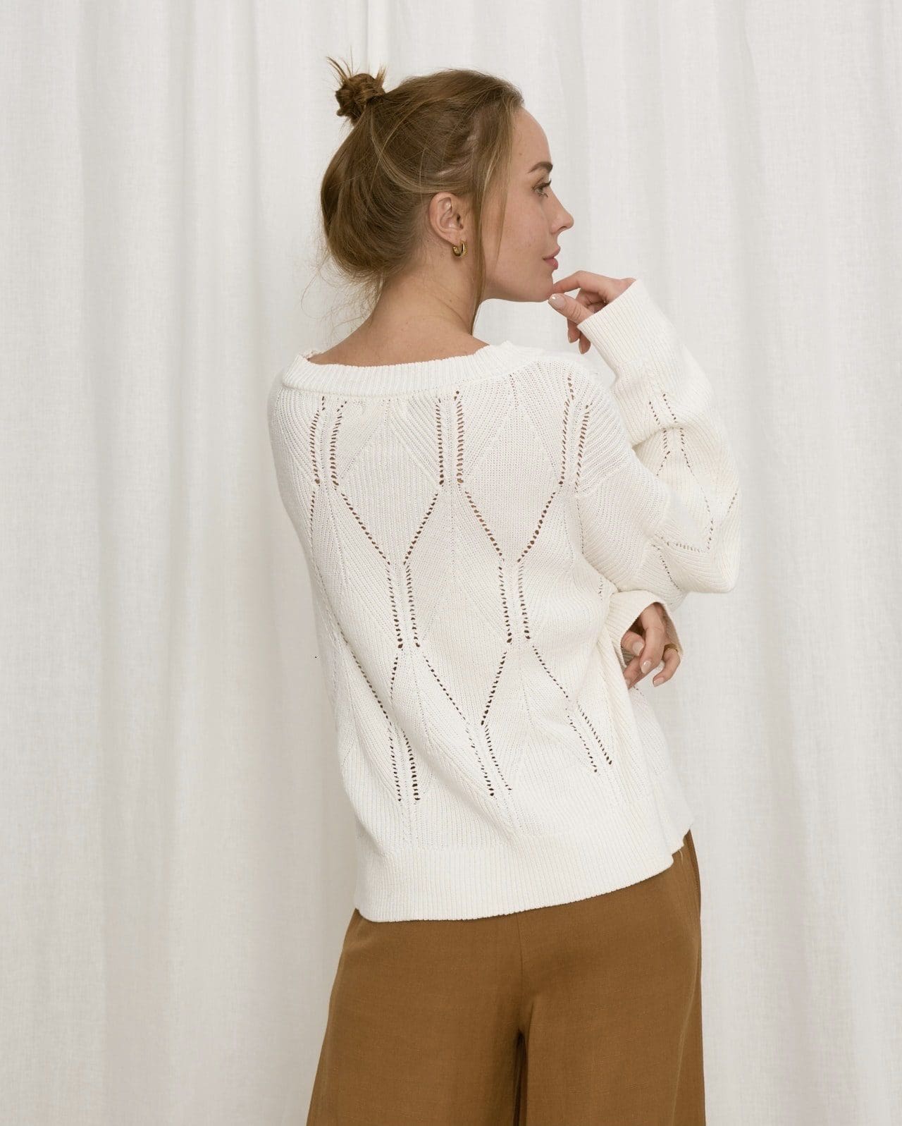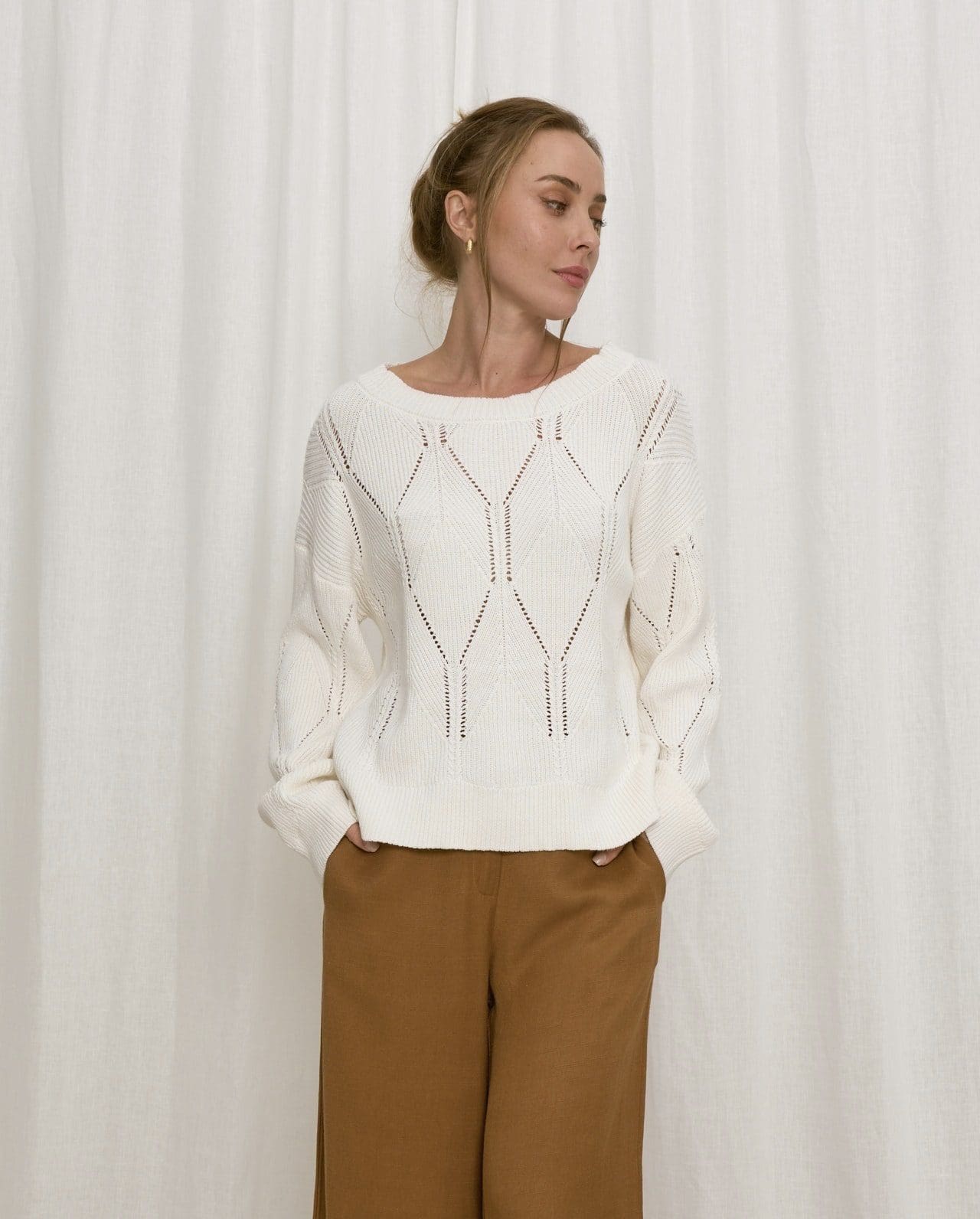Get a warm and cosy feeling when you wear our new Carolyn Knit. It’s super light-weight and comfortable – perfect for the transition from winter to spring. This cotton-based white knit is all kinds of beautiful!