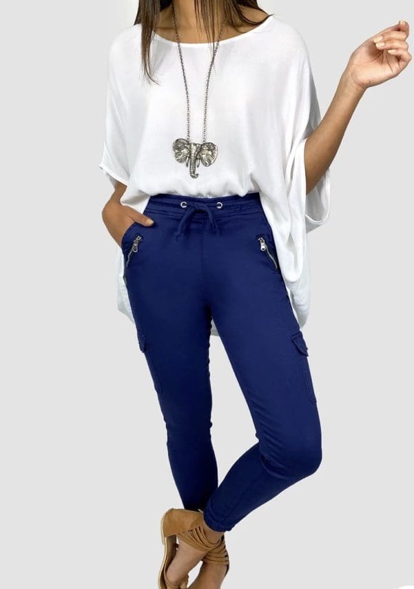 Our Navy Elastic Waistband chino joggers are perfect for all shapes & sizes. Super comfy and stretchy. Great quality, high waisted with drawstring, cuffed ankle with cargo pockets. Definitely a wardrobe essential.
