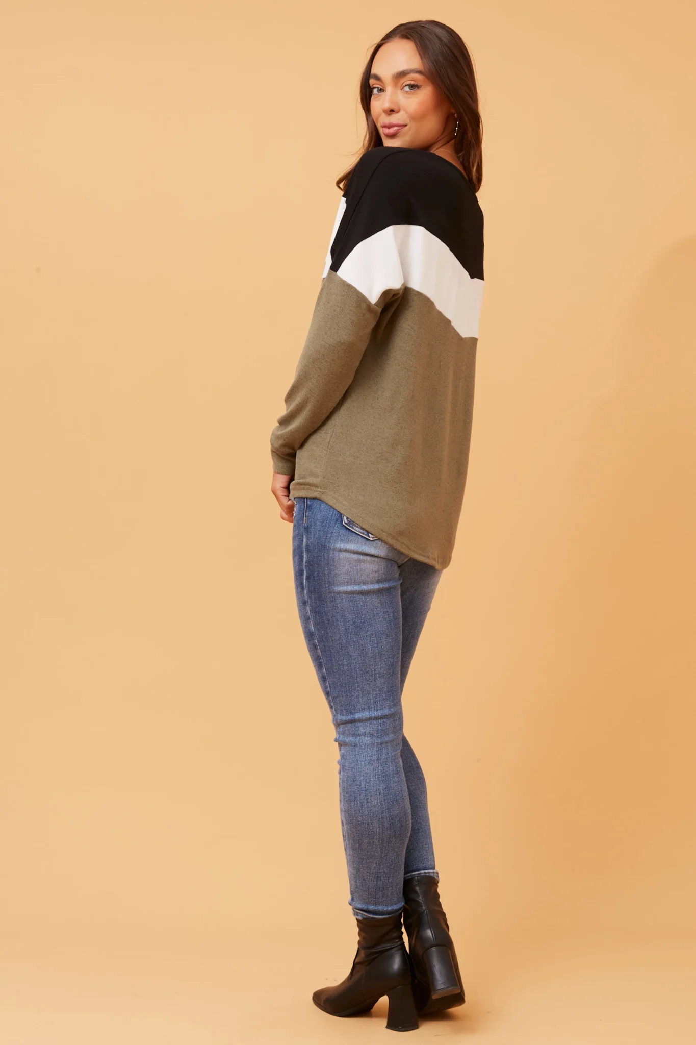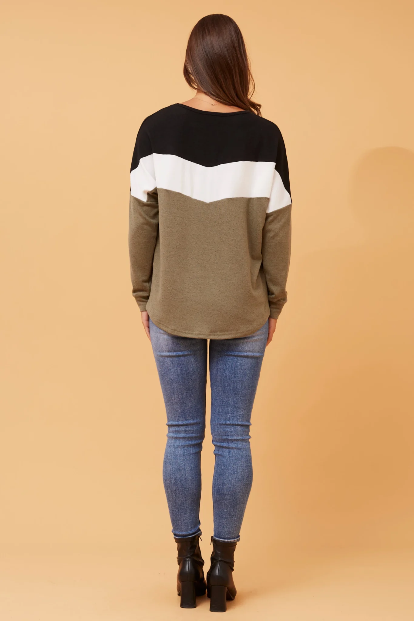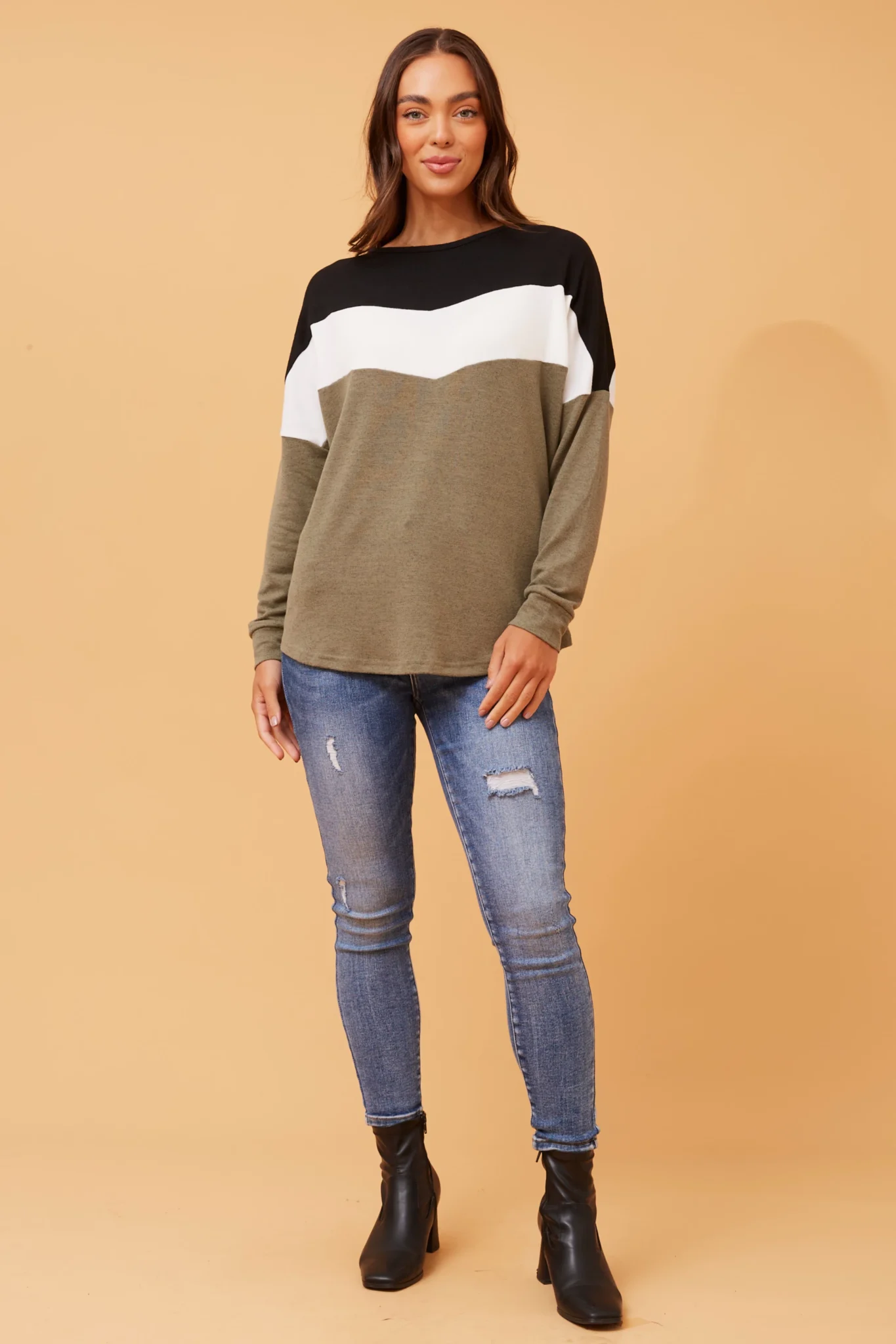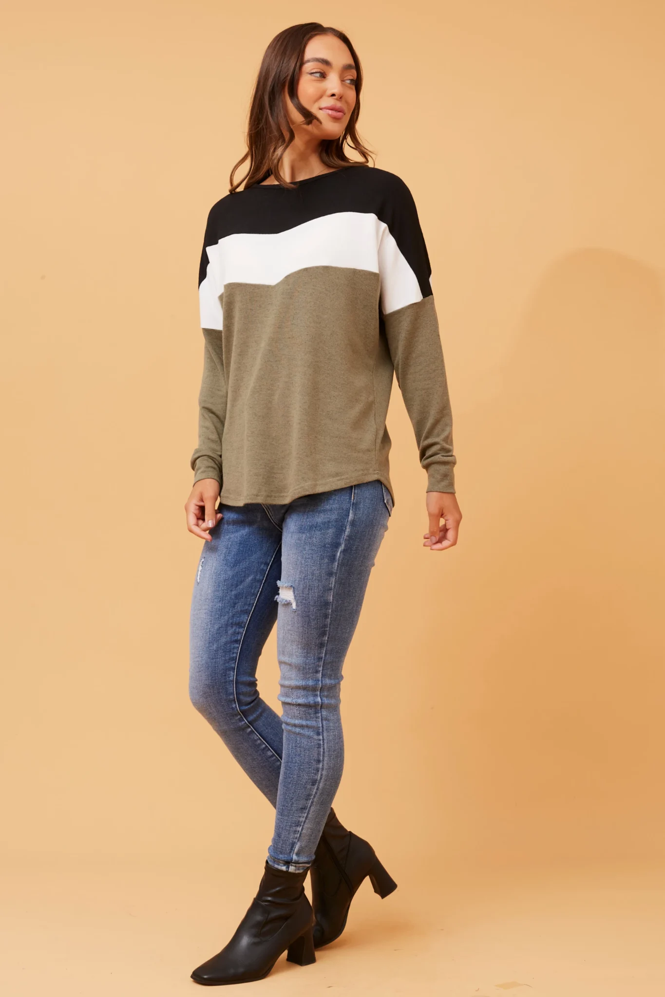 Elevate your autumn wardrobe with the Delsey top, featuring a stylish color block print. Pair with denim jeans and sneakers for a casually relaxed everyday look.