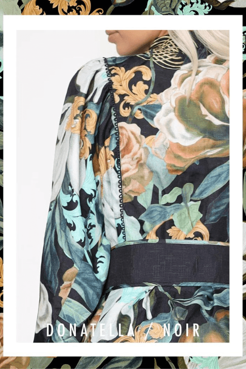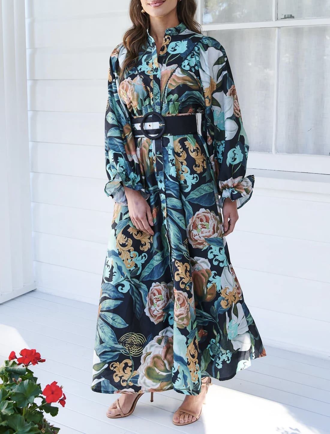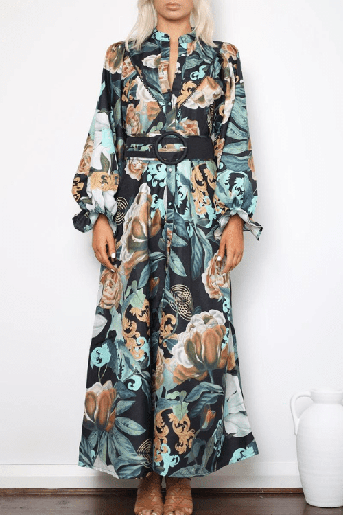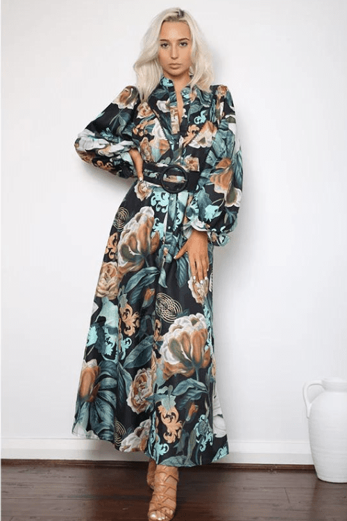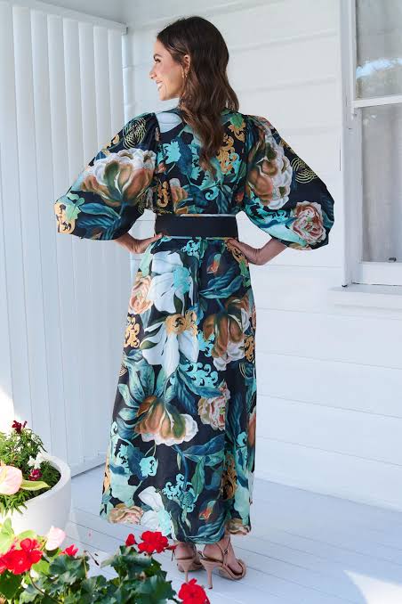 We’re in love with our new Donatella Range! The New maxi dress is here with Mandarin collar, black crochet lace trim in v front, puffed elastic sleeves with fluted cuffs & Contrast belt!