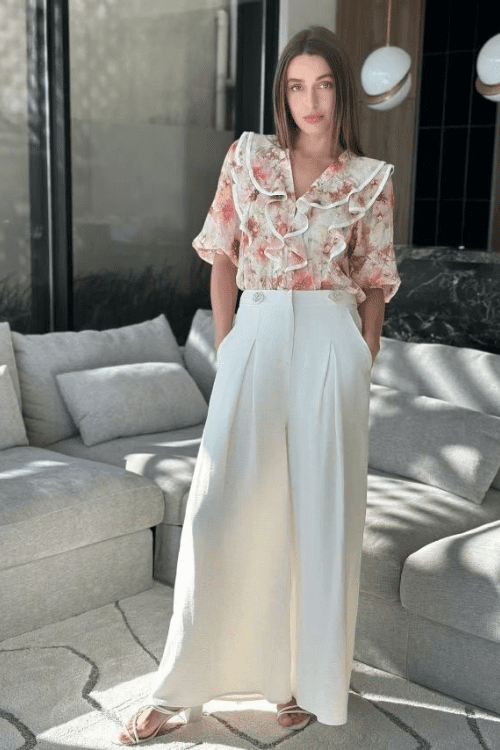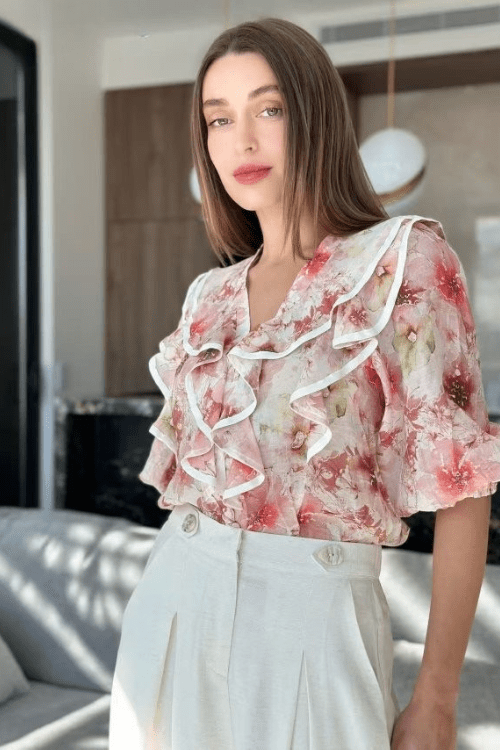 A romantic floral blouse featuring a ruffled front and neckline, elasticated sleeves, and a floaty bodice. Feminine and effortless, perfect for day-to-night styling.