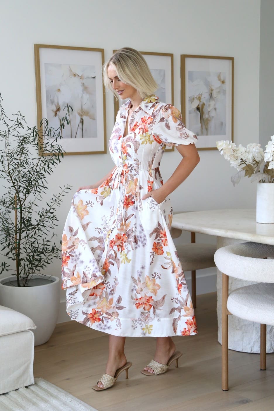 The Fall Floral Maxi is a stunning easy throw on dress – featuring a collared neckline, floaty structured sleeves and self tie – this maxi dress is a season favourite!