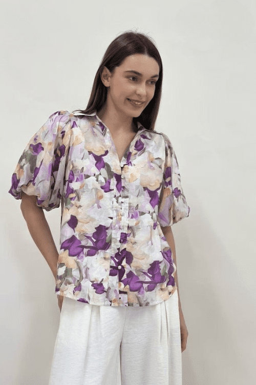 An elevated staple with a collared neckline and button-down front, balanced by voluminous elasticated sleeves. Effortlessly chic and perfect for styling up or down.
