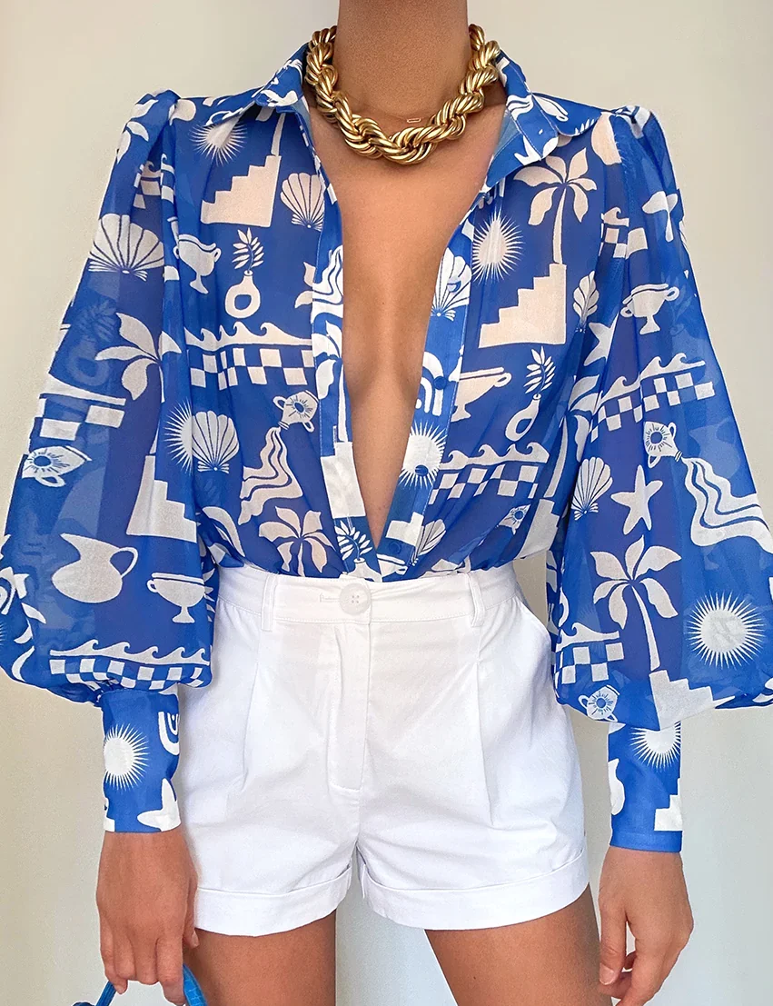 Our Fleetwood Blouse features a long floaty sleeve with button cuff detail, centre-front buttons, and a collar. No lining and not stretch however a relaxed fit, chiffon lightweight fabric which is super soft.
