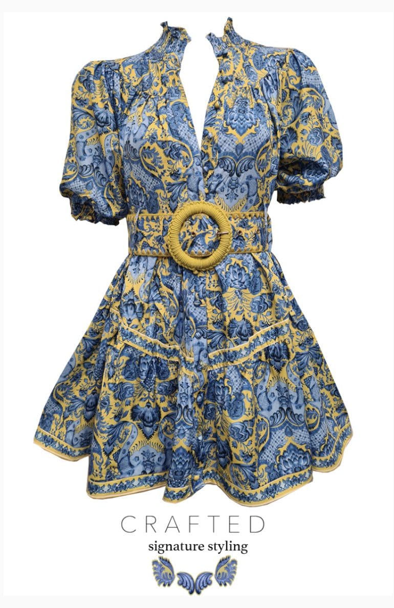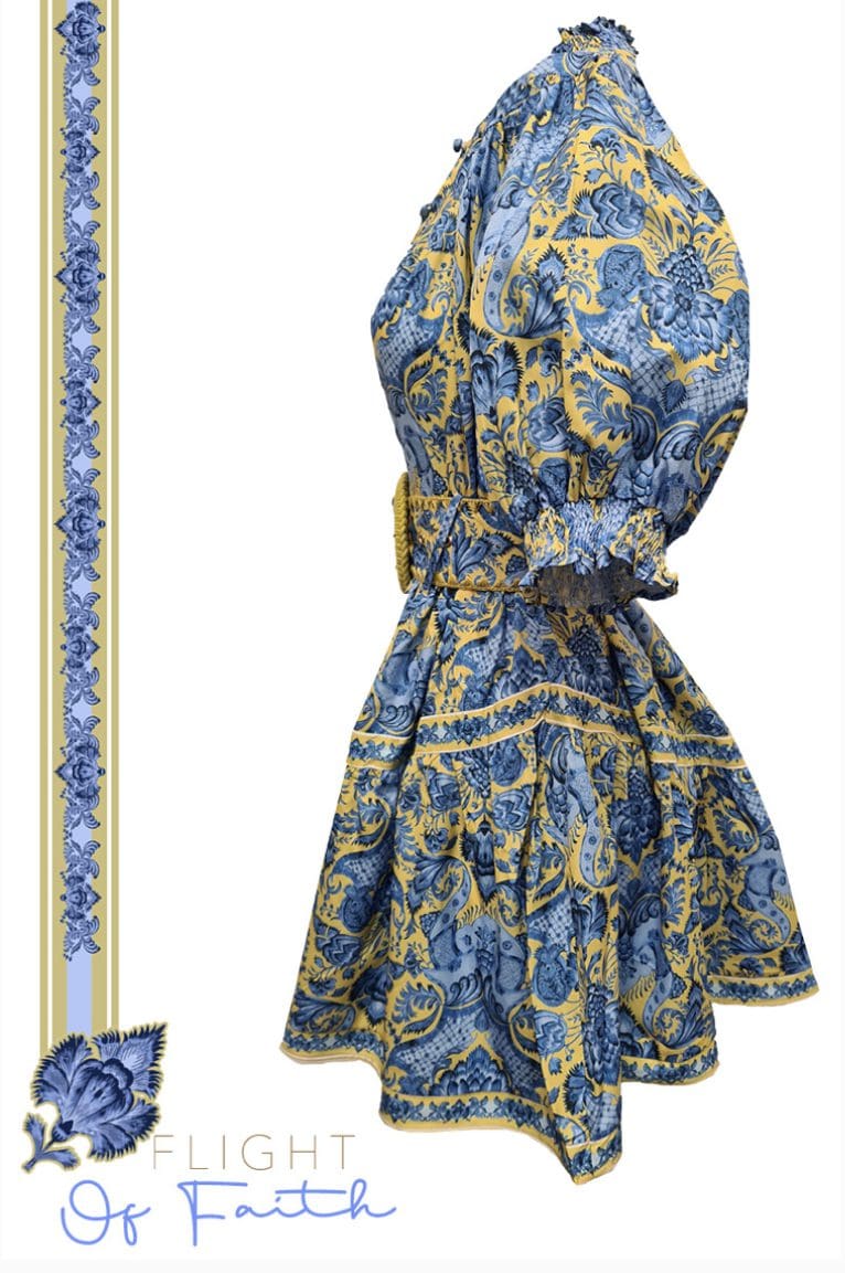 Dress like royalty in our new Flight of Faith Dress. This exclusive print button down dress features puffy sleeves, shirring at cuff and collar and crochet boho buckle.