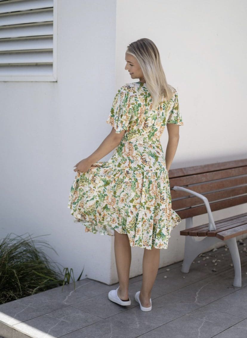 Say hello to your new favourite dress – the Flora Dress! This elegant midi dress is ideal for any season – whether it’s really hot, or a bit chilly! Featuring a v-neckline, floaty sleeves, self tie and beautiful design – you really can wear this dress anywhere!