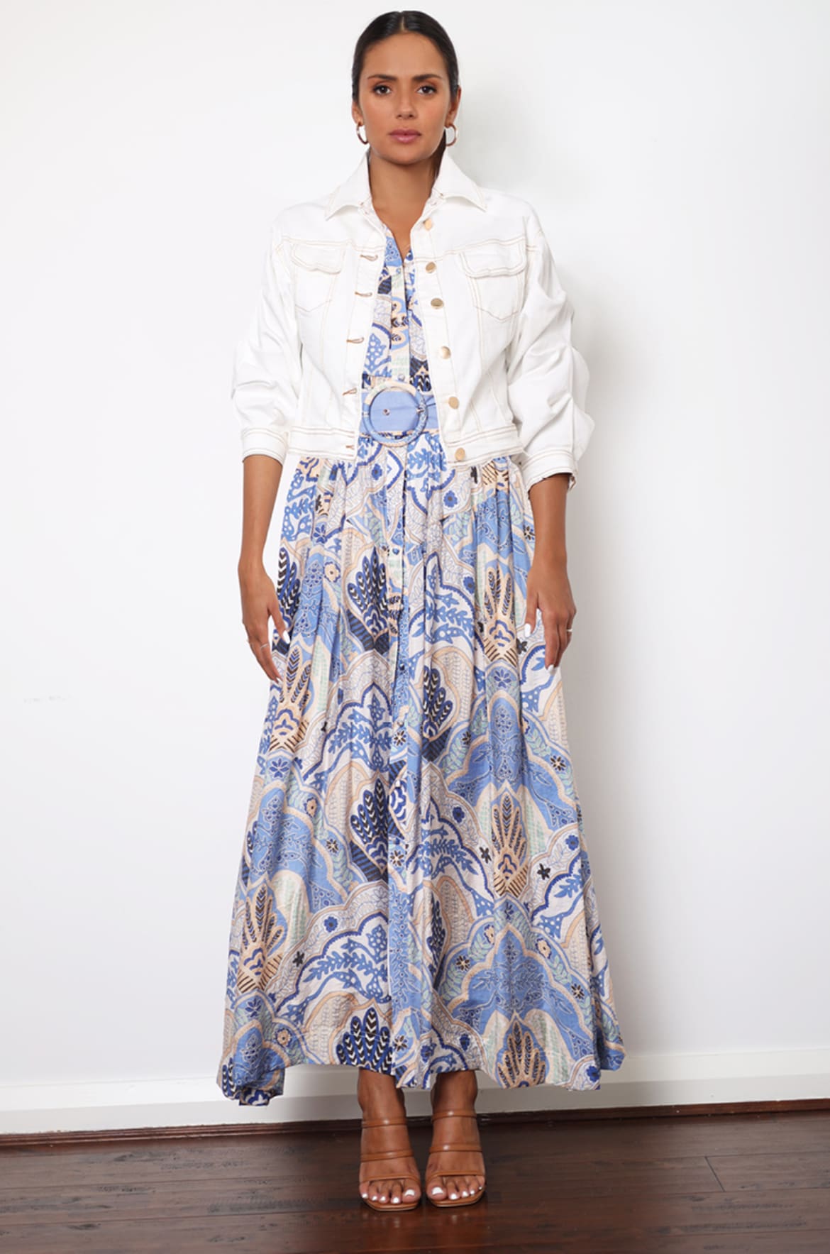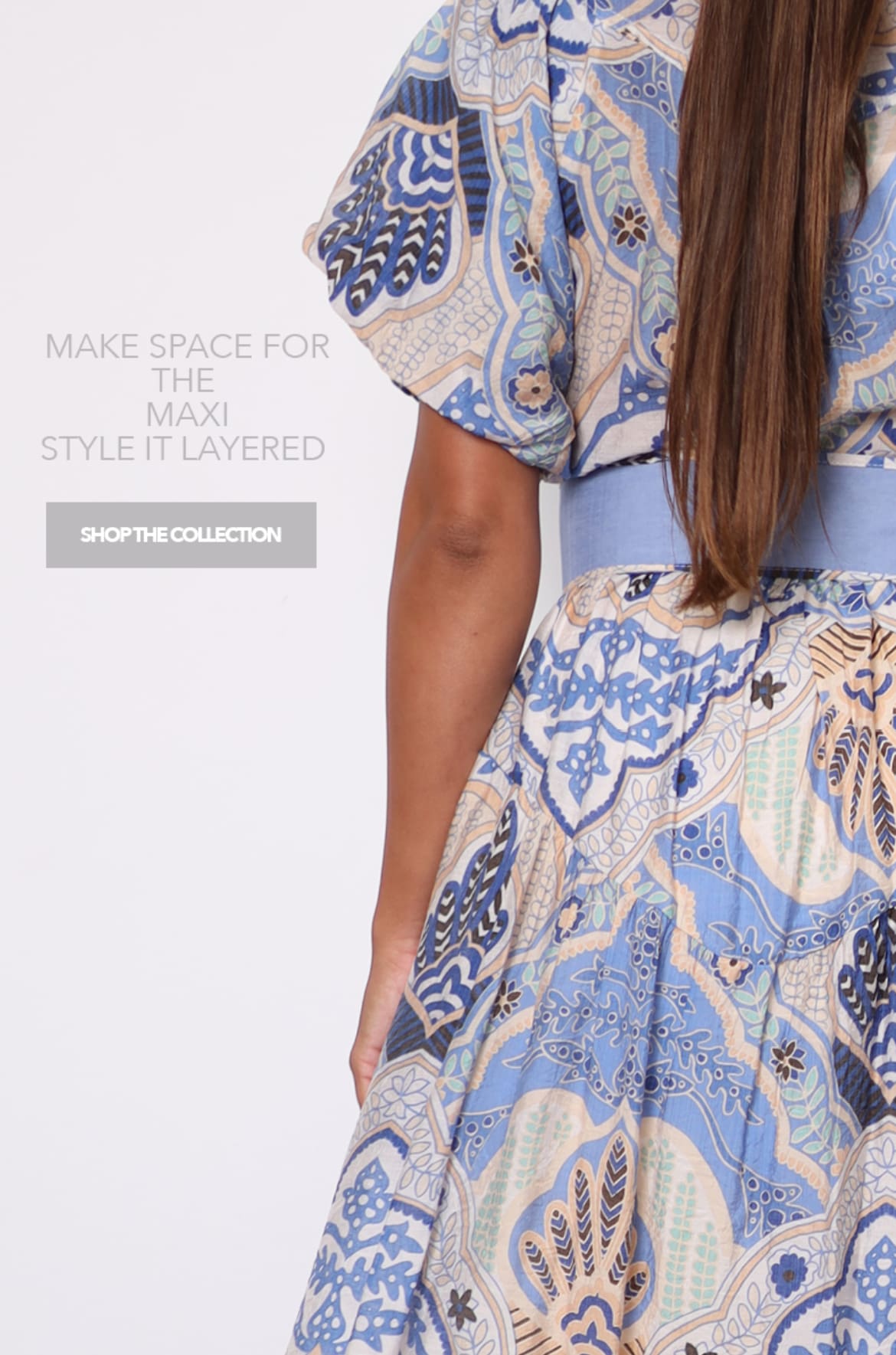 Our Harper new maxi features an exclusive print with gorgeous belt and collared neckline.