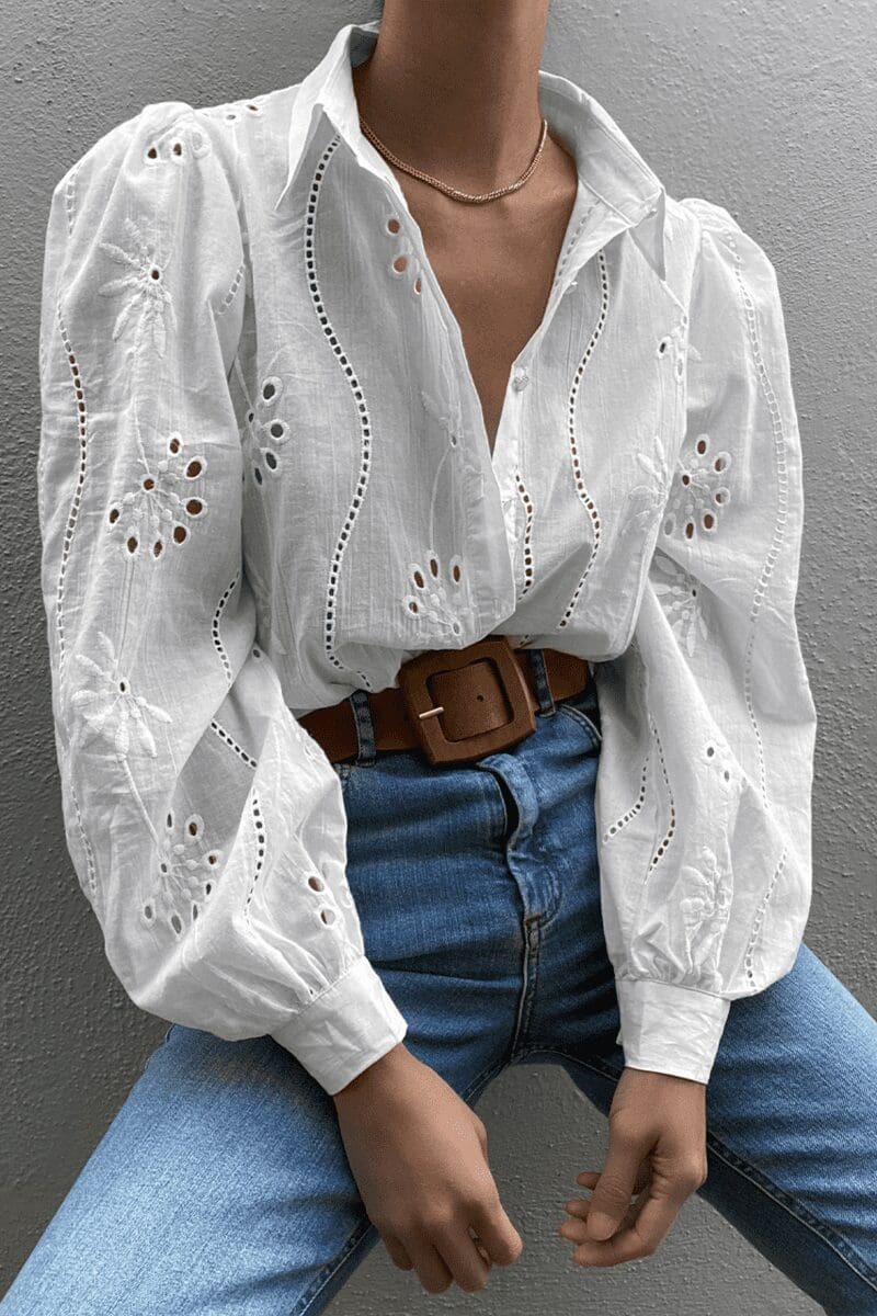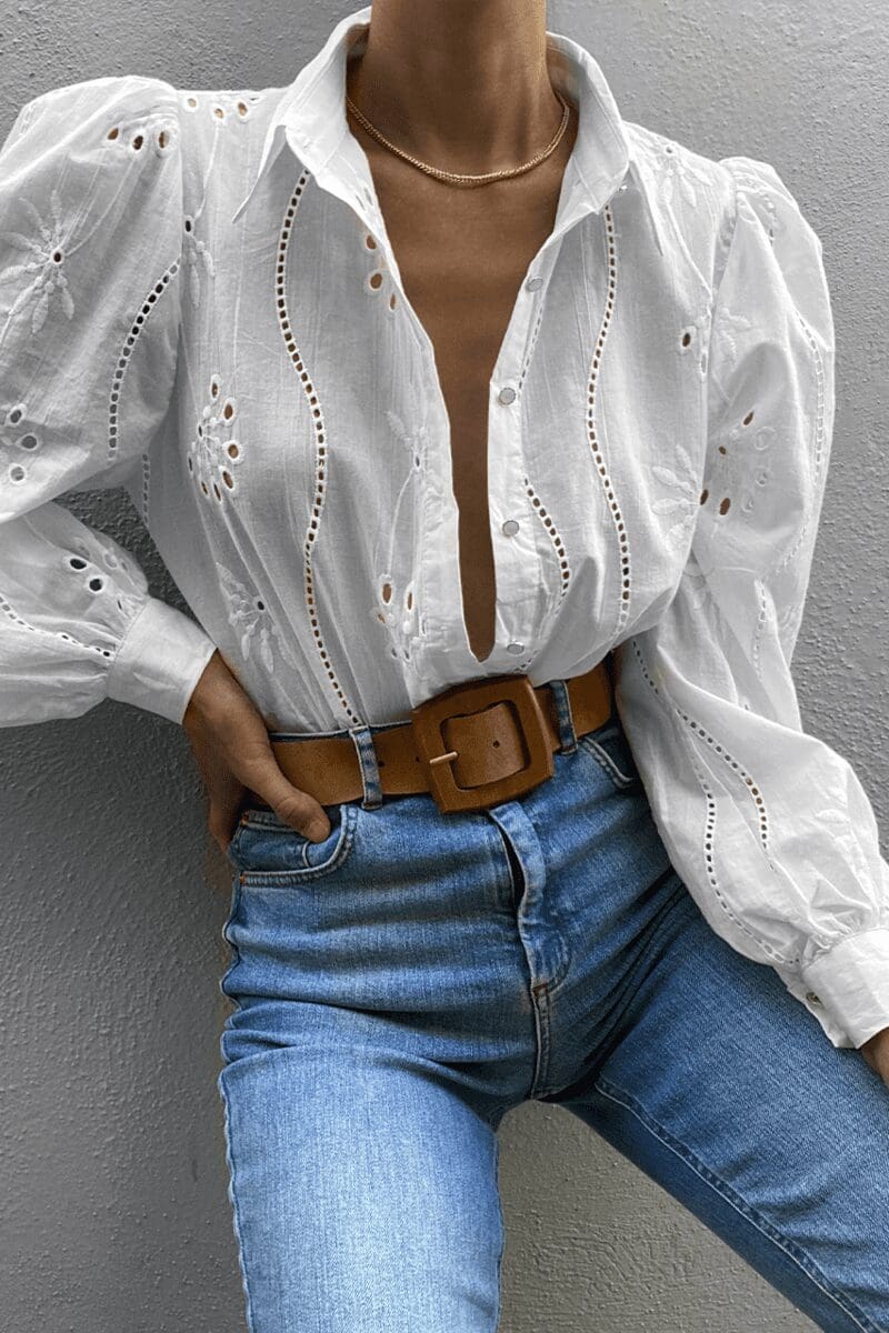 You can never have enough button up shirts in your wardrobe. Our Knowles Blouse has long sleeves, a centre front button opening and perforated patters throughout. 100% Cotton