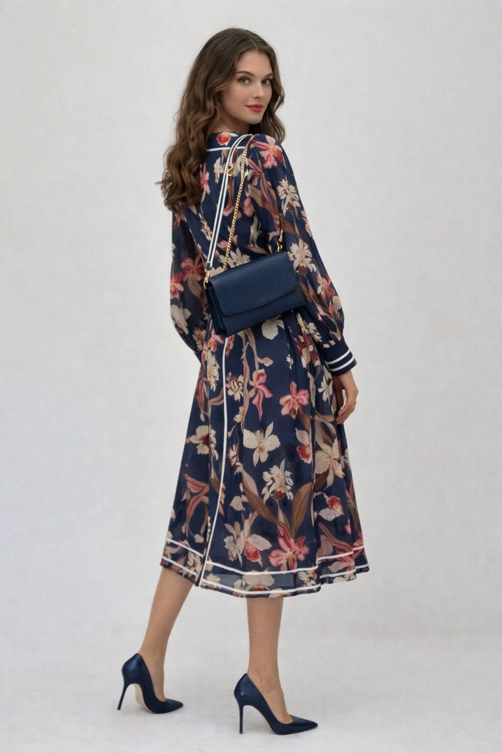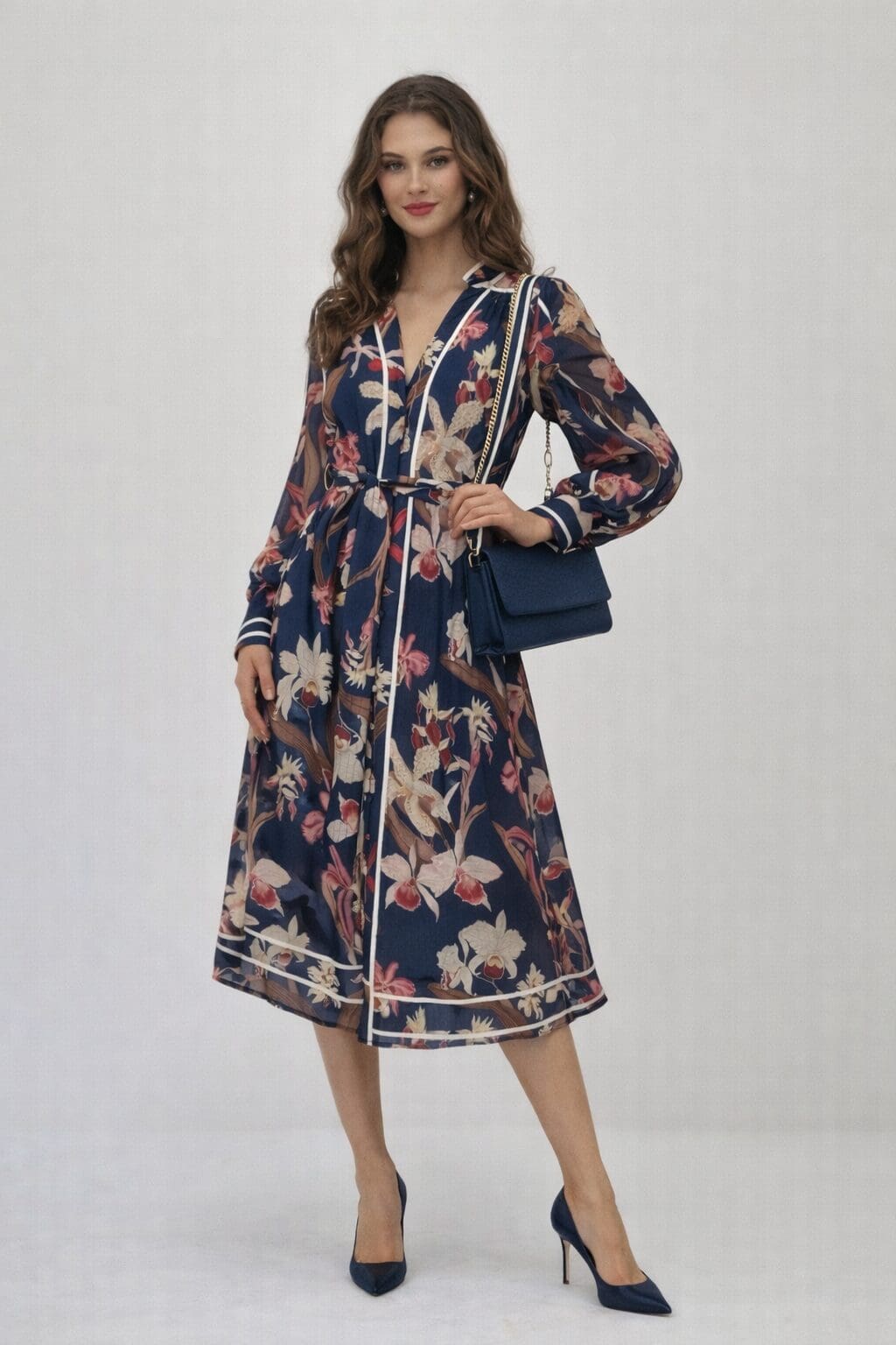 The Lyndal Dress is an effortlessly elegant piece designed to make a statement. Featuring a striking navy base with a soft floral print and contrast trim detailing, this flowing midi dress offers a flattering silhouette that’s perfect for both day and evening occasions.