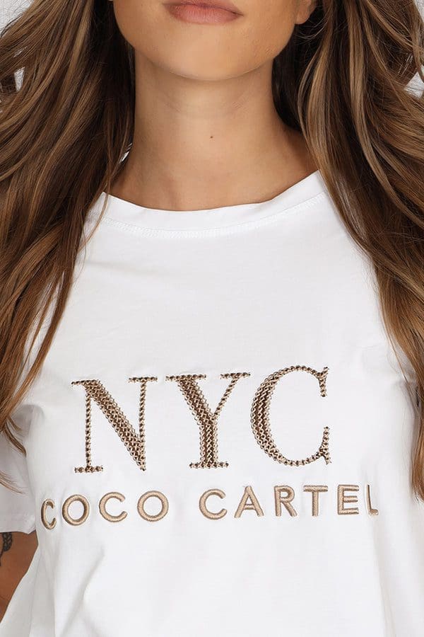 Features Coco Cartel embroidery, relaxed fit, elongated sleeve, round neckline, curved hemline, 95% cotton stretch.