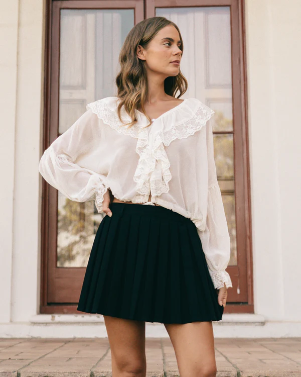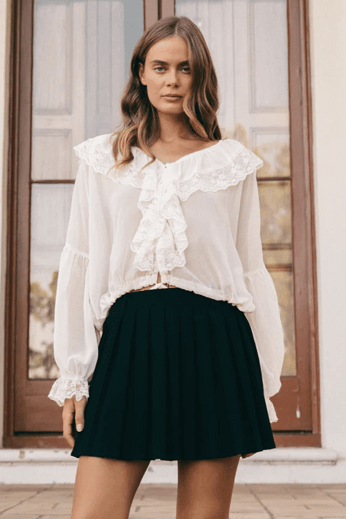 ∙ V-neck collar ∙ Long sleeves ∙ Ruffled neckline and wrists ∙ Adjustable tie waist ∙ Relaxed fit ∙ Our model is wearing size 8