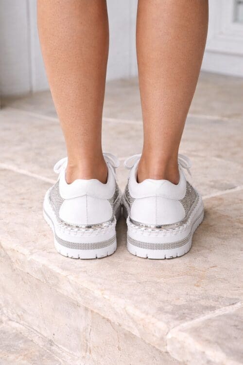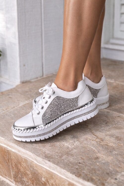 Introducing the best shoe you’ll ever wear – the sky white sneakers! These leather sneakers add a touch of sparkle to any look. With a high-top look, a silver trim, thick stiches around the shoe & silver sparkles all around the top, these shoes are made for your glamourous style. What’s even better? They’re incredibly comfy – with a comfy sole ready to wear! Pair these shoes with your favourite jeans or dress – or even a wedding dress!