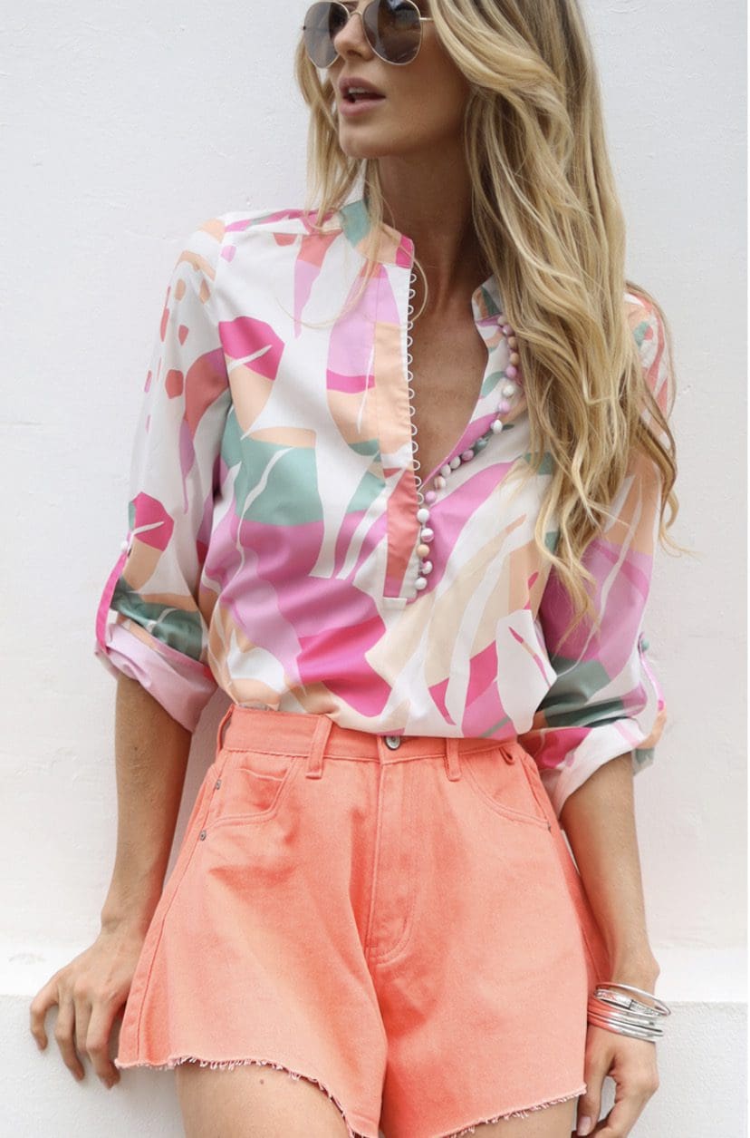 How gorgeous are these pastels? This stunning exclusive print blouse features a johnny collar and button-down neckline.