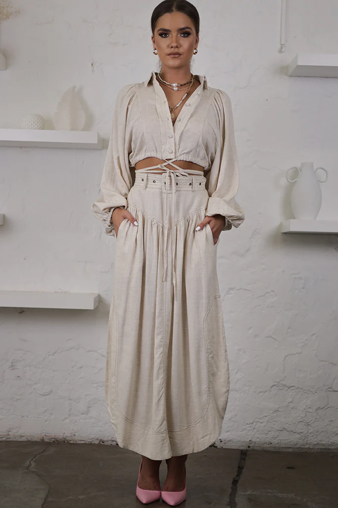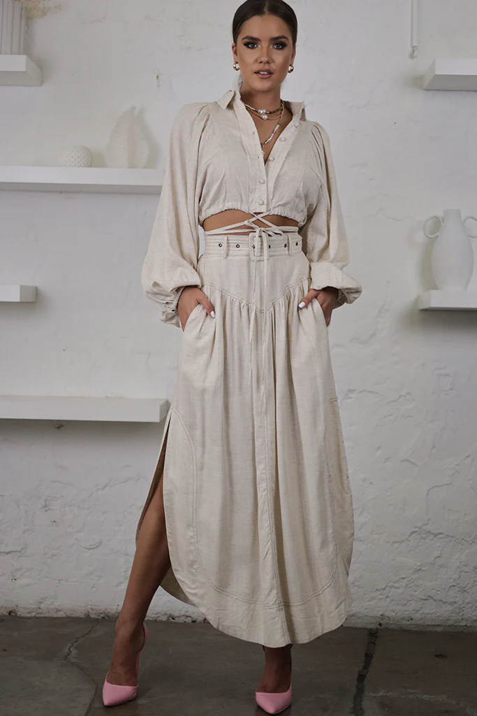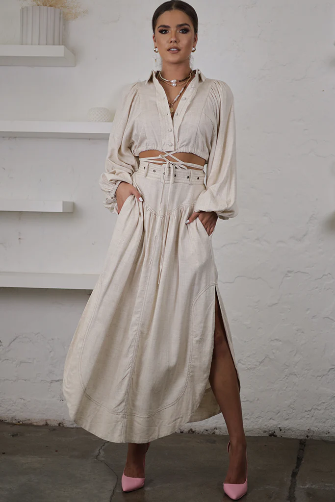 ive your transeasonal wardrobe a seriously chic update with this skirt. Featuring a linen look fabric with a corset v front and a midi length, we’re in love. Style with a crop top and tie-up heels for a combo we’re crushing on.