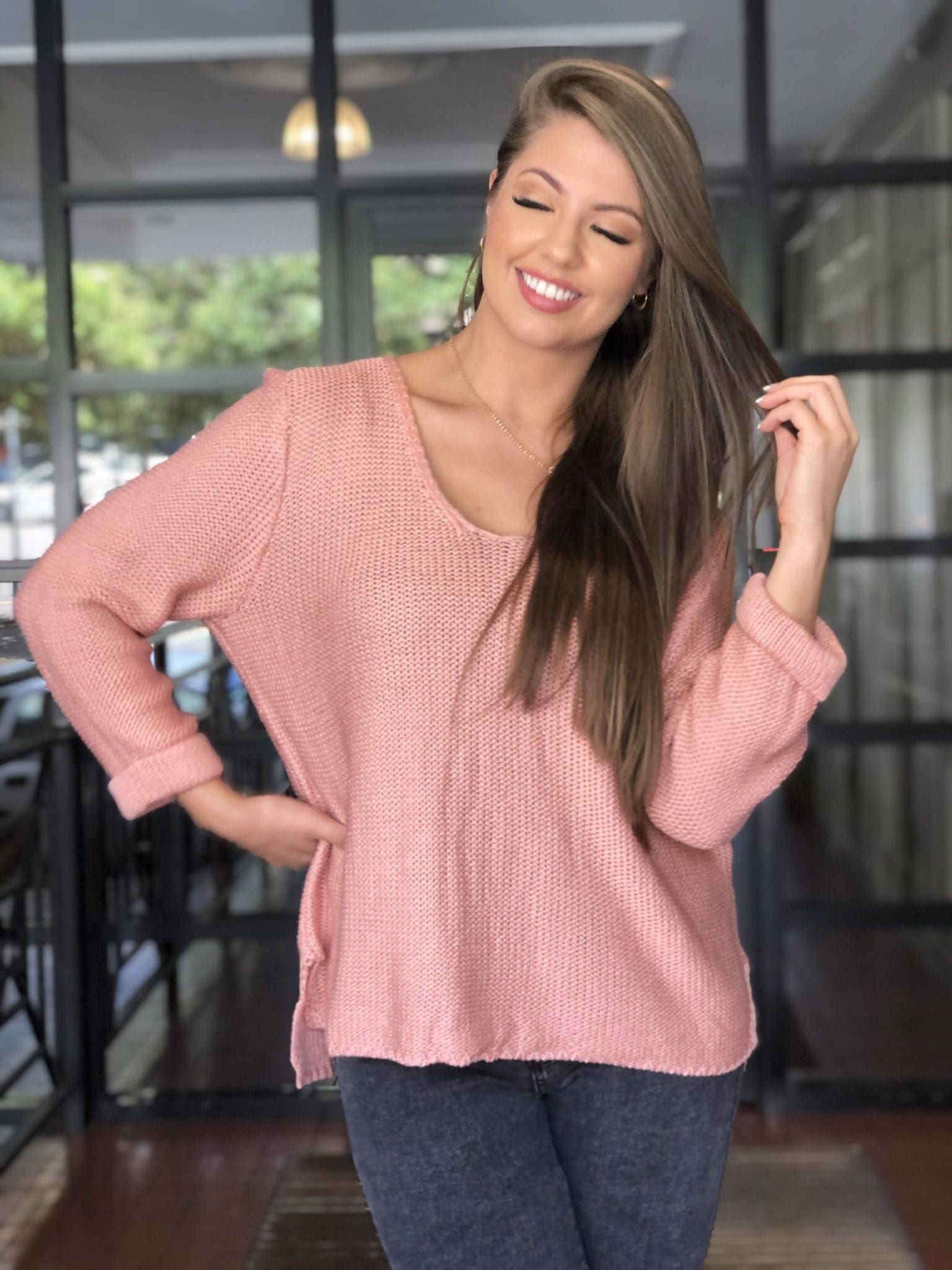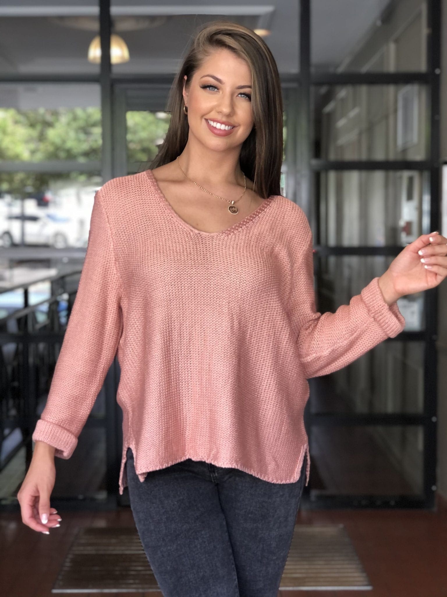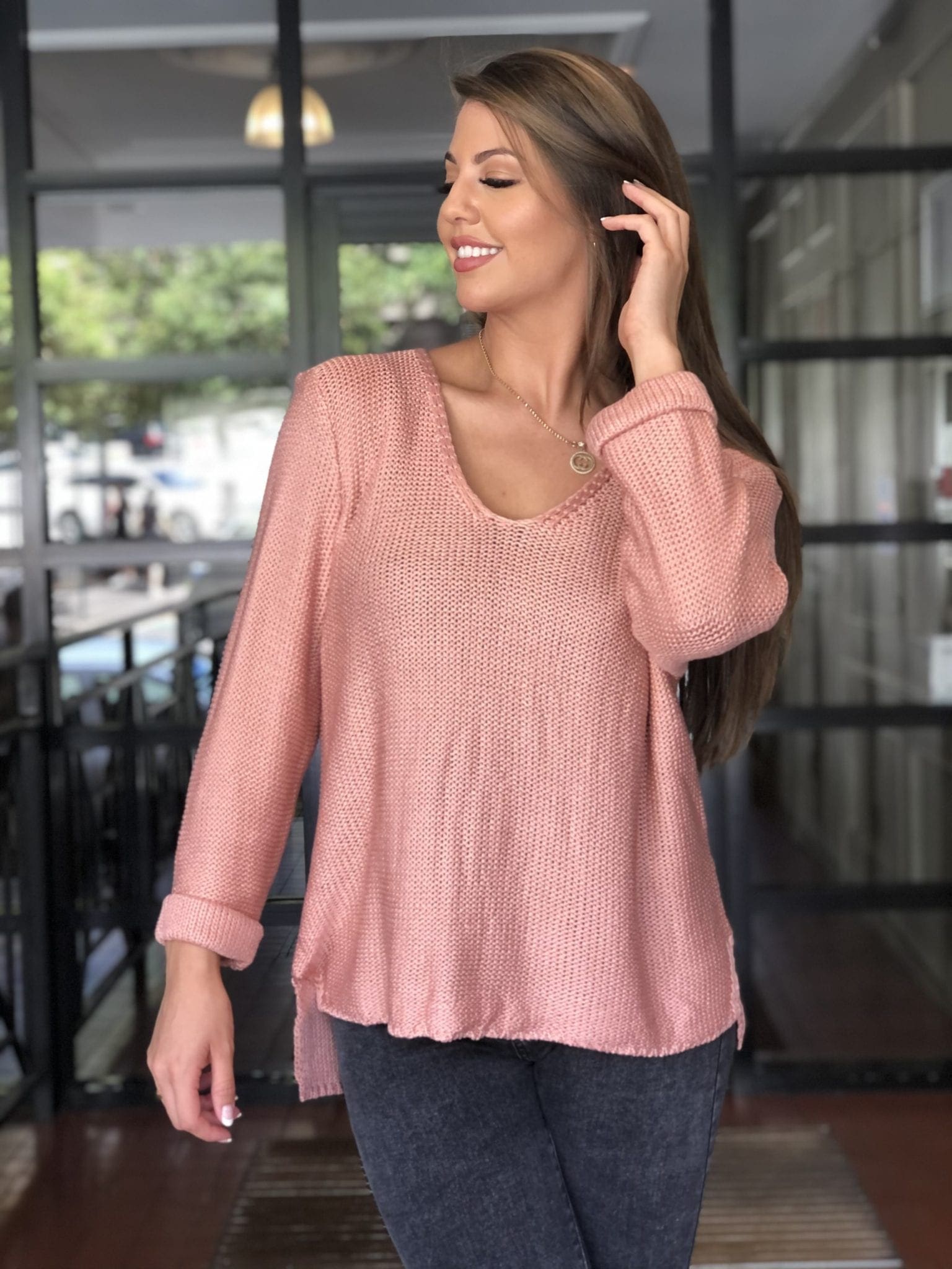 Our Valerie V neck Rose Gold, Silver Wishes Knit is our go to knit. Light weight cotton with a rolled up detail sleeve (85% Cotton). Once you have one you’ll be sure you’ll purchase another. Comes in many different colours. Side splits, loose fit and V neckline. Great for all year round. A must have staple piece for you wardrobe.