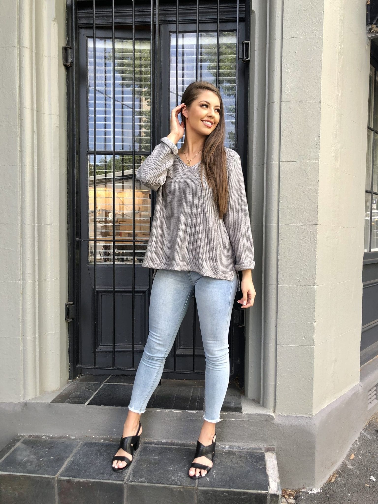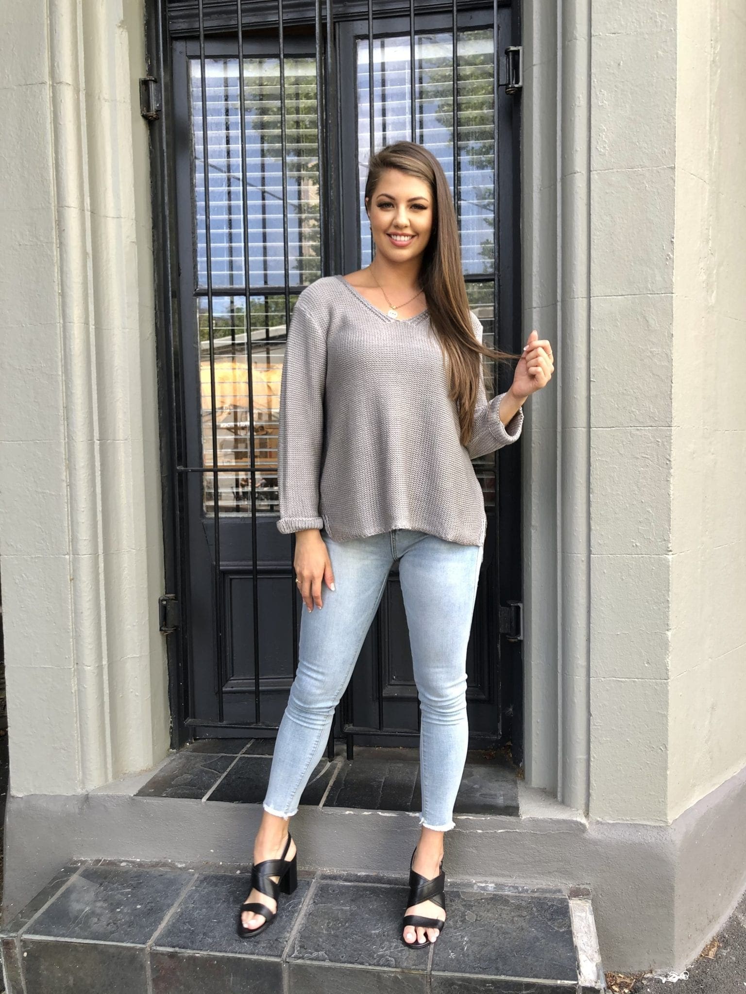 Our Valerie V neck Silver, Silver Wishes Knit is our go to knit. Light weight cotton with a rolled up detail sleeve (85% Cotton). Once you have one you’ll be sure you’ll purchase another. Comes in many different colours. Side splits, loose fit and V neckline. Great for all year round. A must have staple piece for you wardrobe.